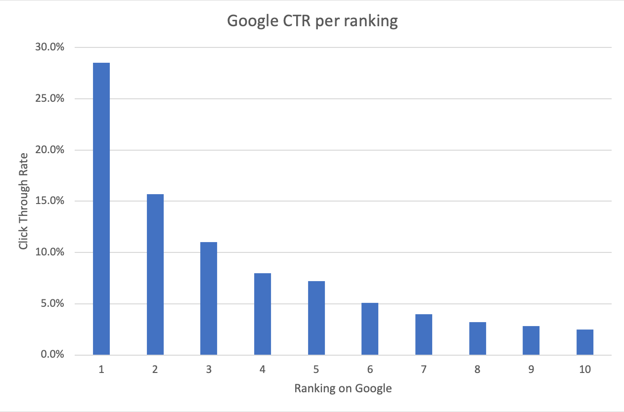 To compare, the first result on Google has a 28.5% click-through rate which means that the website gets clicked on. The lower the position of the website on Google, the lower is the click-through rate.
